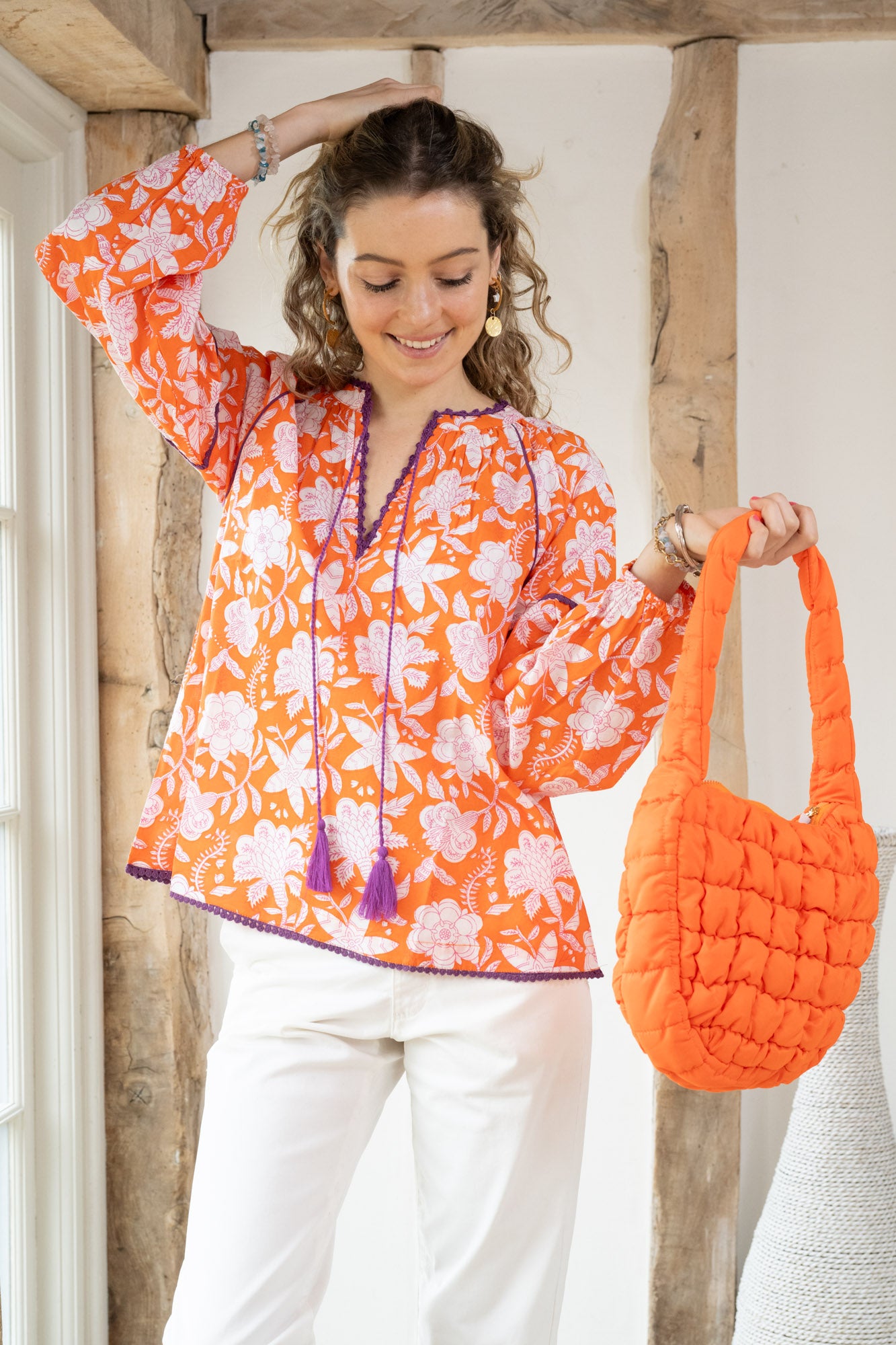 - Choose from deep tangerine with pink & white floral print or Peony Pink with an orange & pink floral print. Both colourways are finished with purple trim