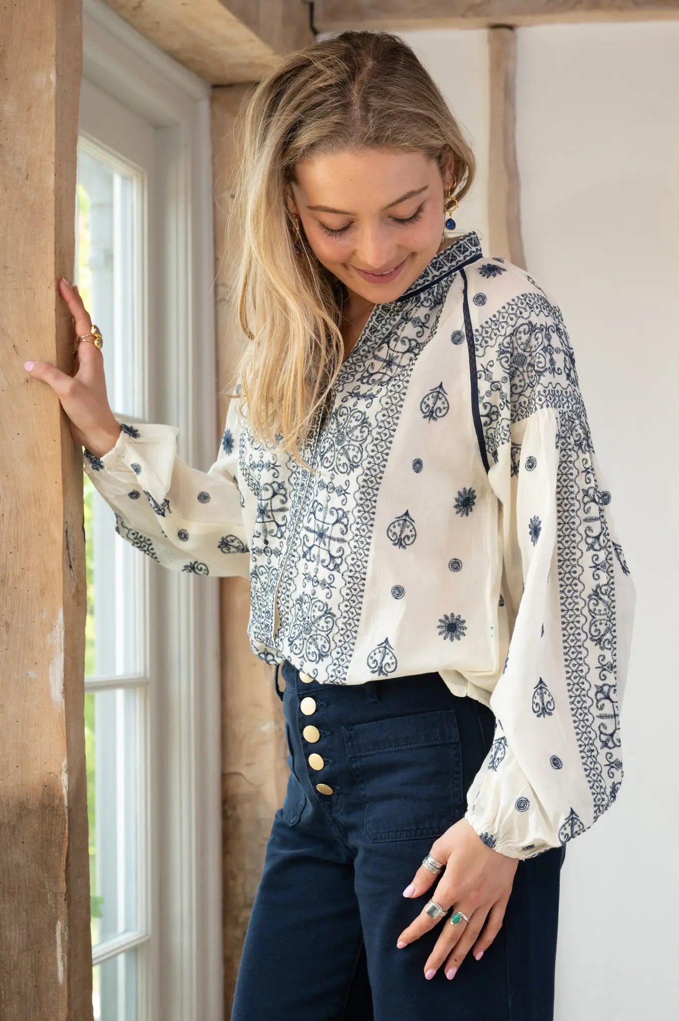 The Cosima Shirt is crafted in airy off-white cotton, draped in deep indigo..