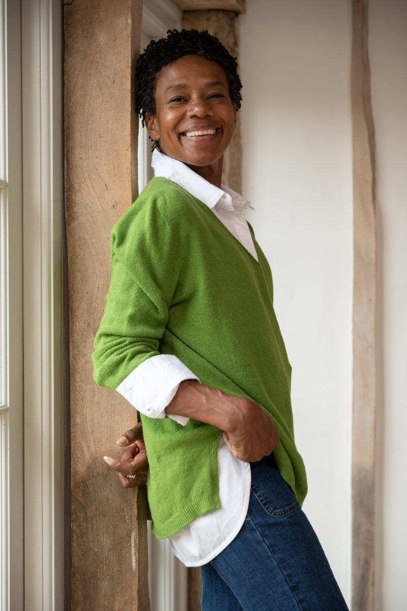 Super-soft sloppy V-necked jersey. One of our best-sellers at White Coco. Easy to wear, a good washer and always great colours.