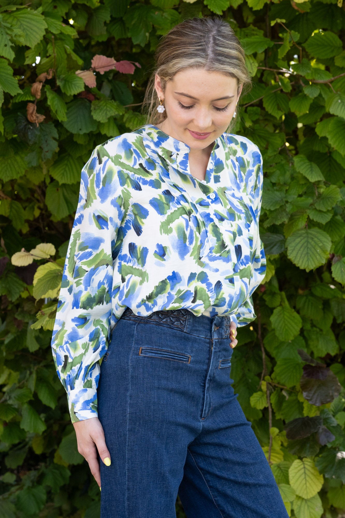 Stunning shirt in a sapphire & grass green print on an ecru background...