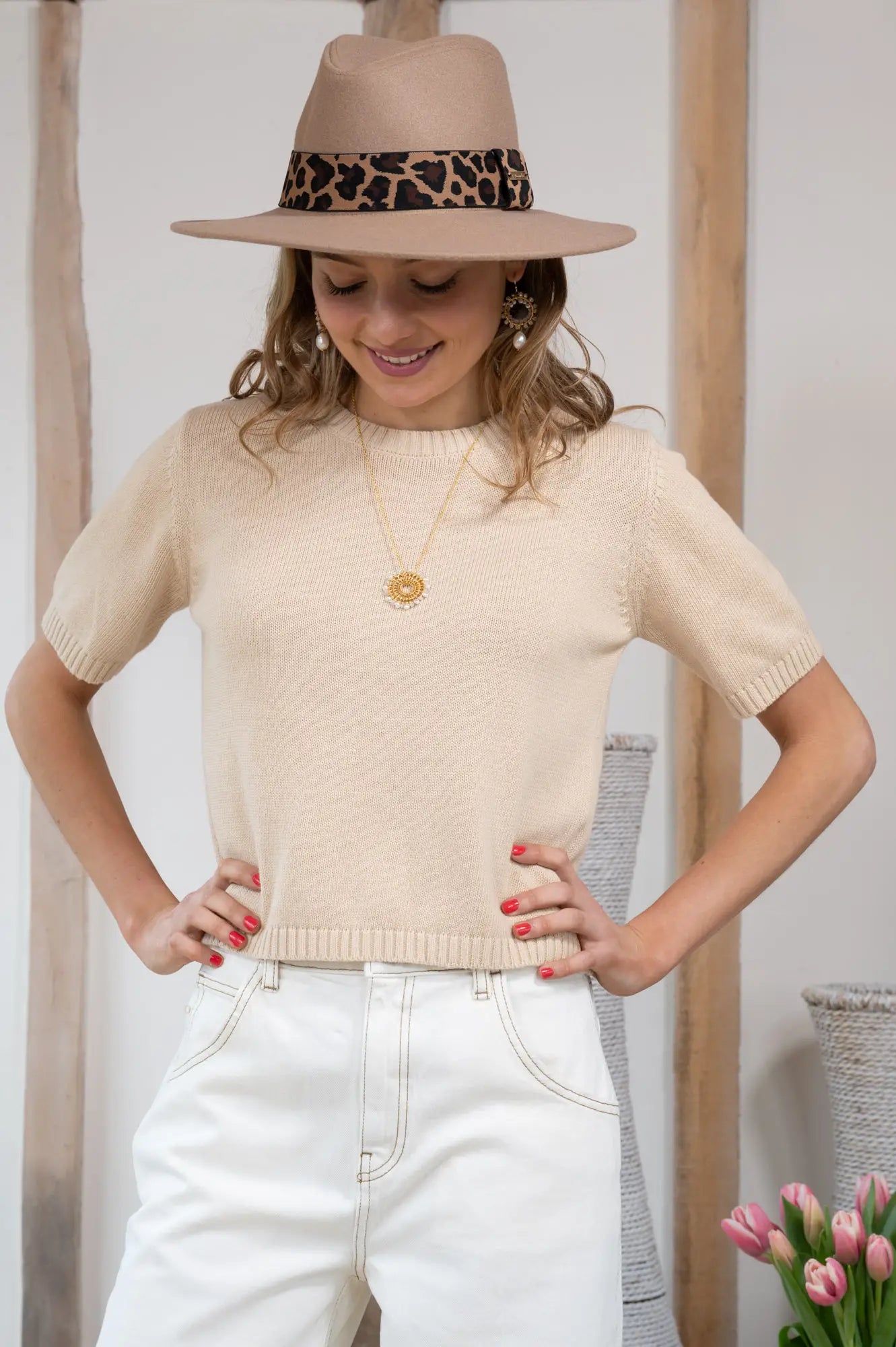 - Felted finish hat with stretch animal print band around crown