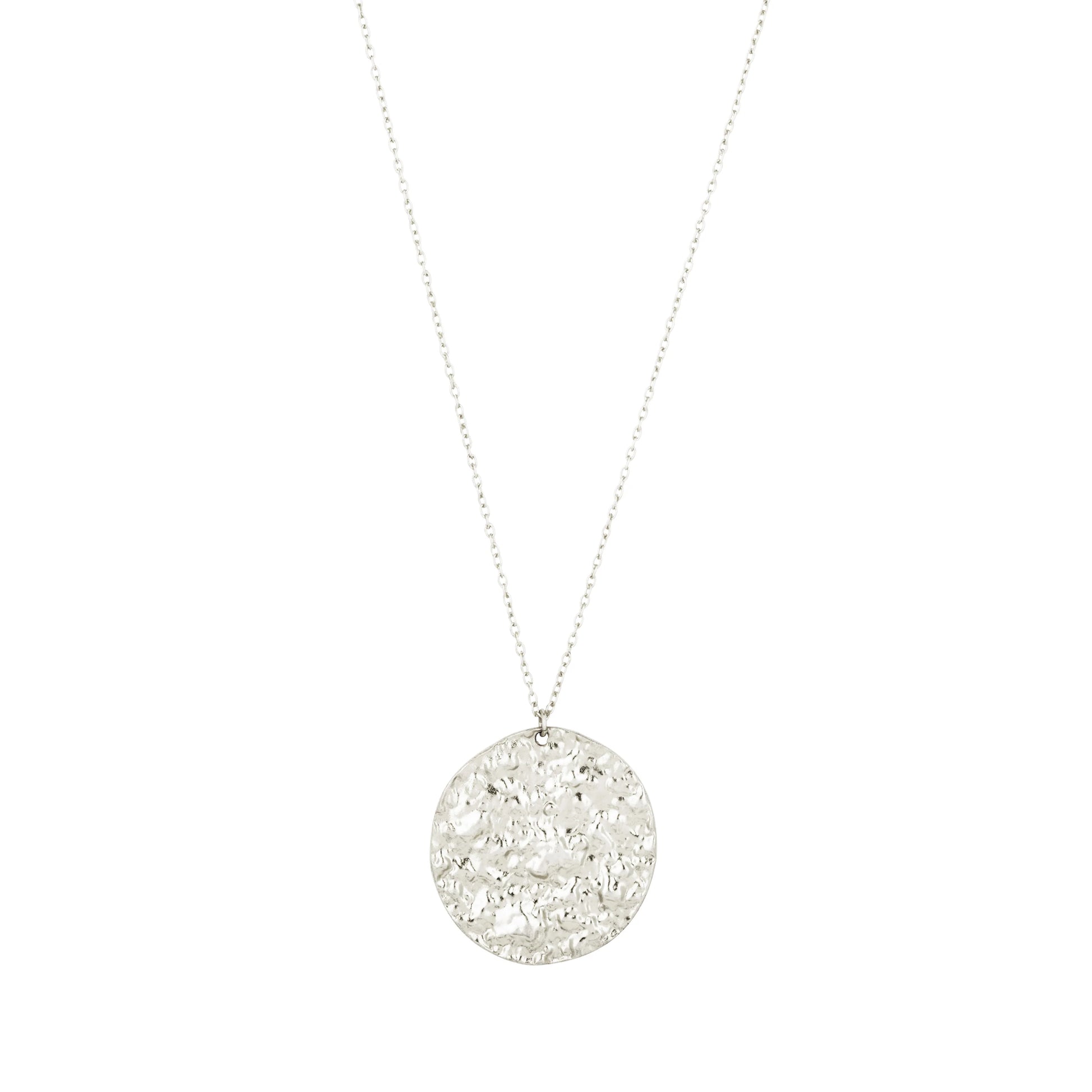 - A hand-textured gold coin on a delicate chain. The coin is attached with with a ring so it can move along the chain