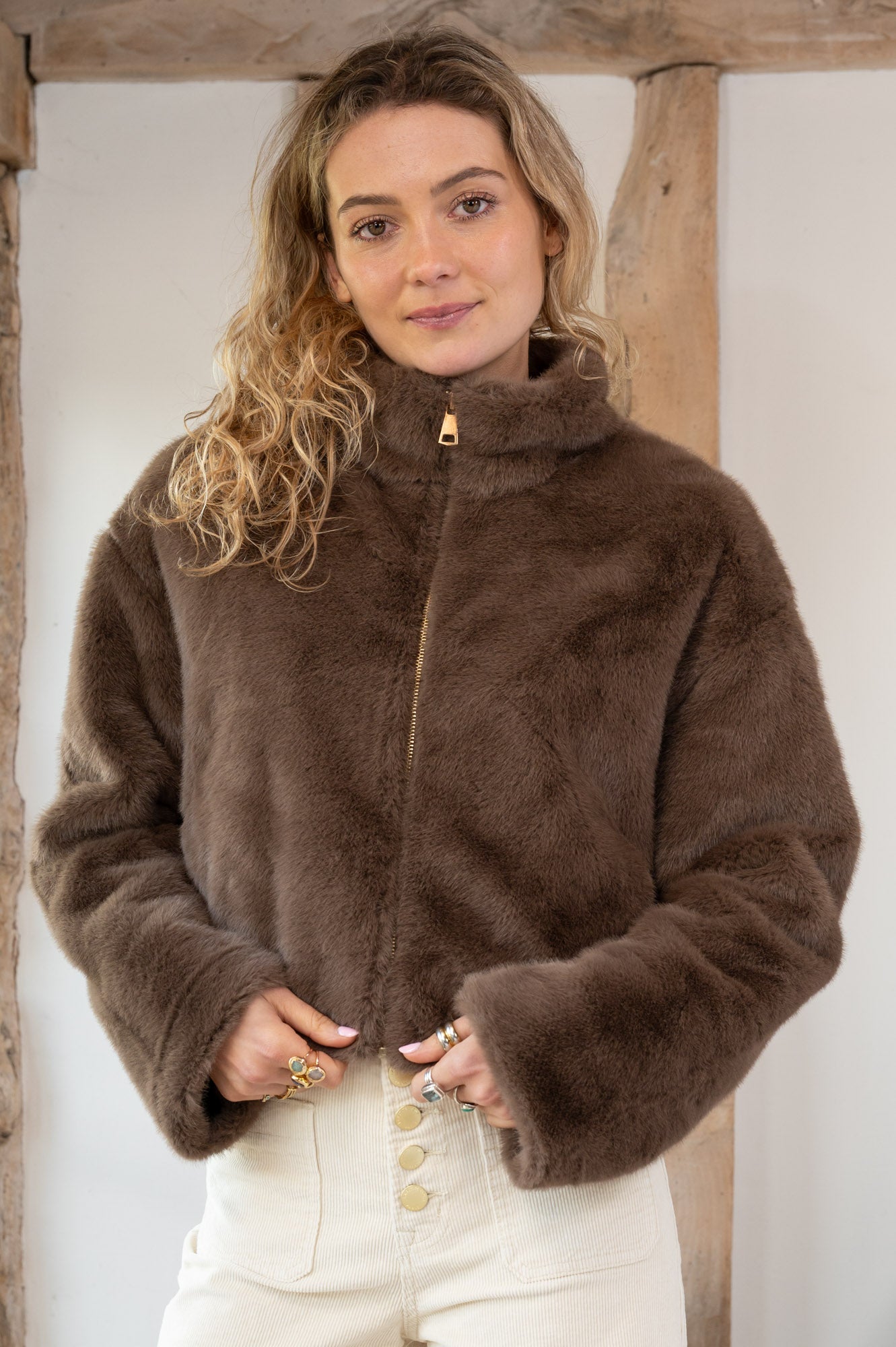 This little shorter bomber-style faux fur jacket is the bees knees. Wear her with jeans or take her to a party, she'll do both jobs well...