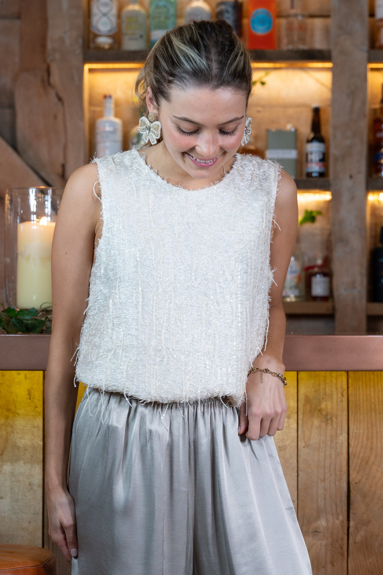 - Feather-like fabric wih the tiniest clear sequins sewn on giving a subtle shimmer