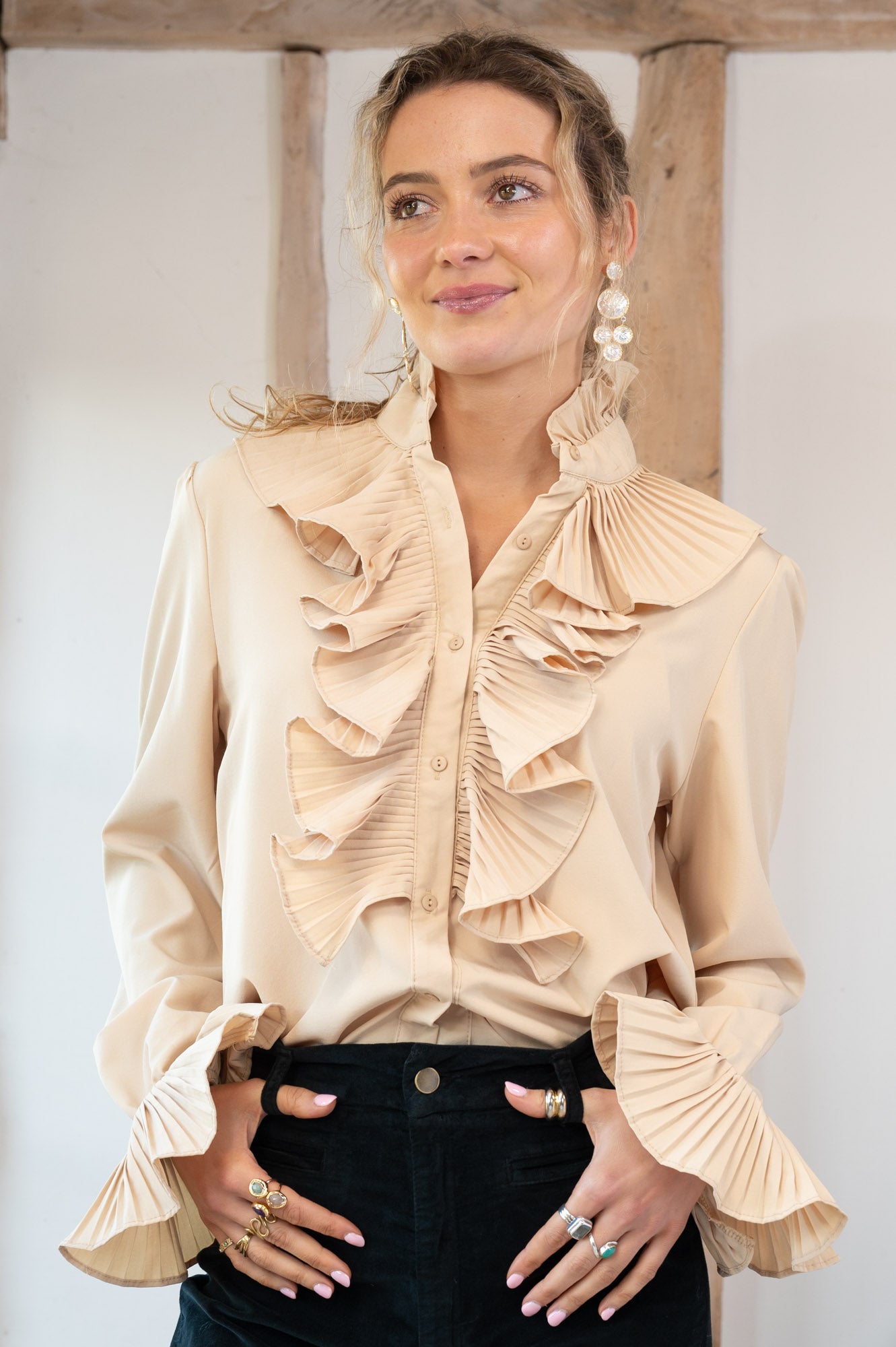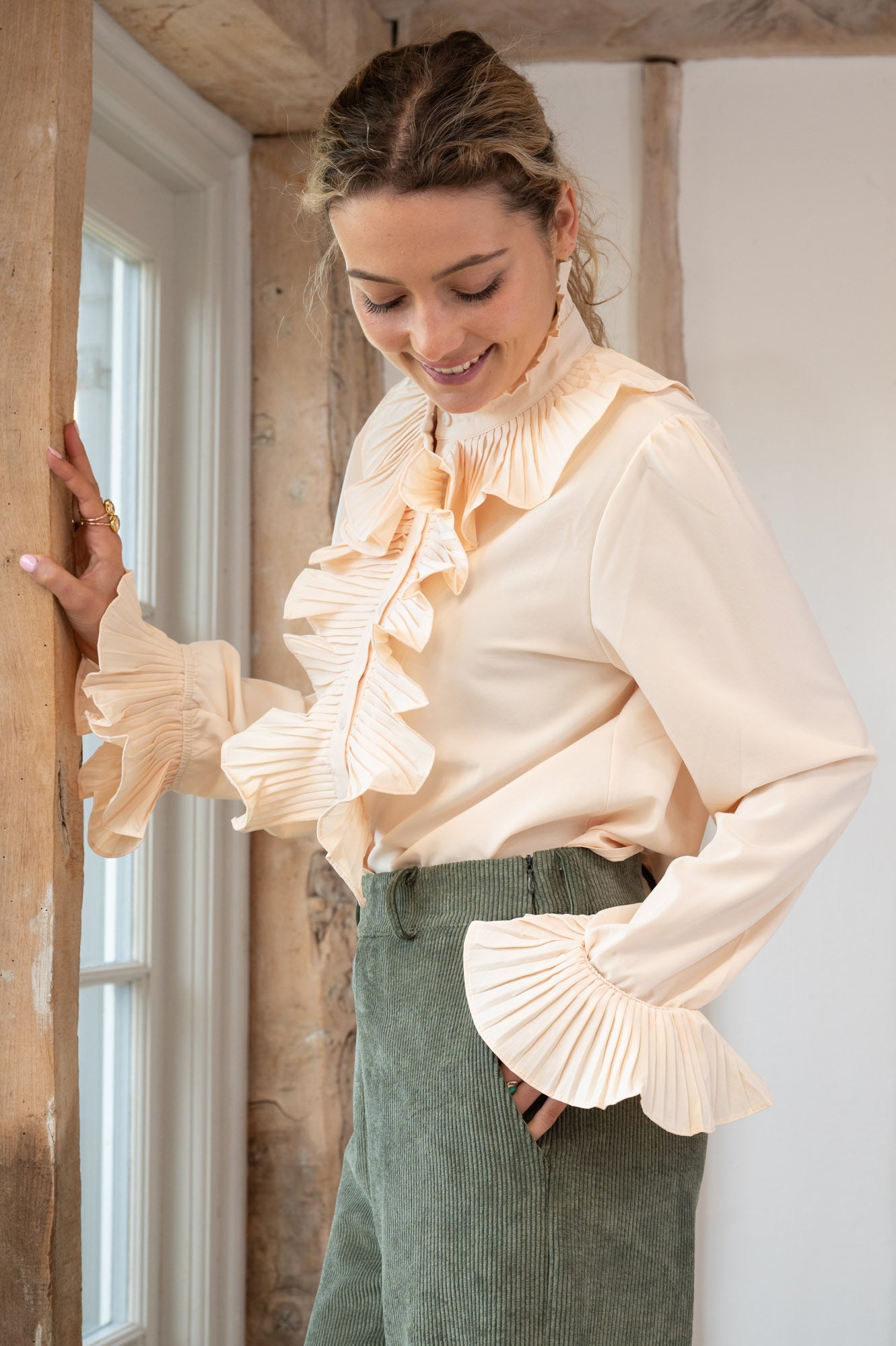 - Full length sleeves with ruffled cuff