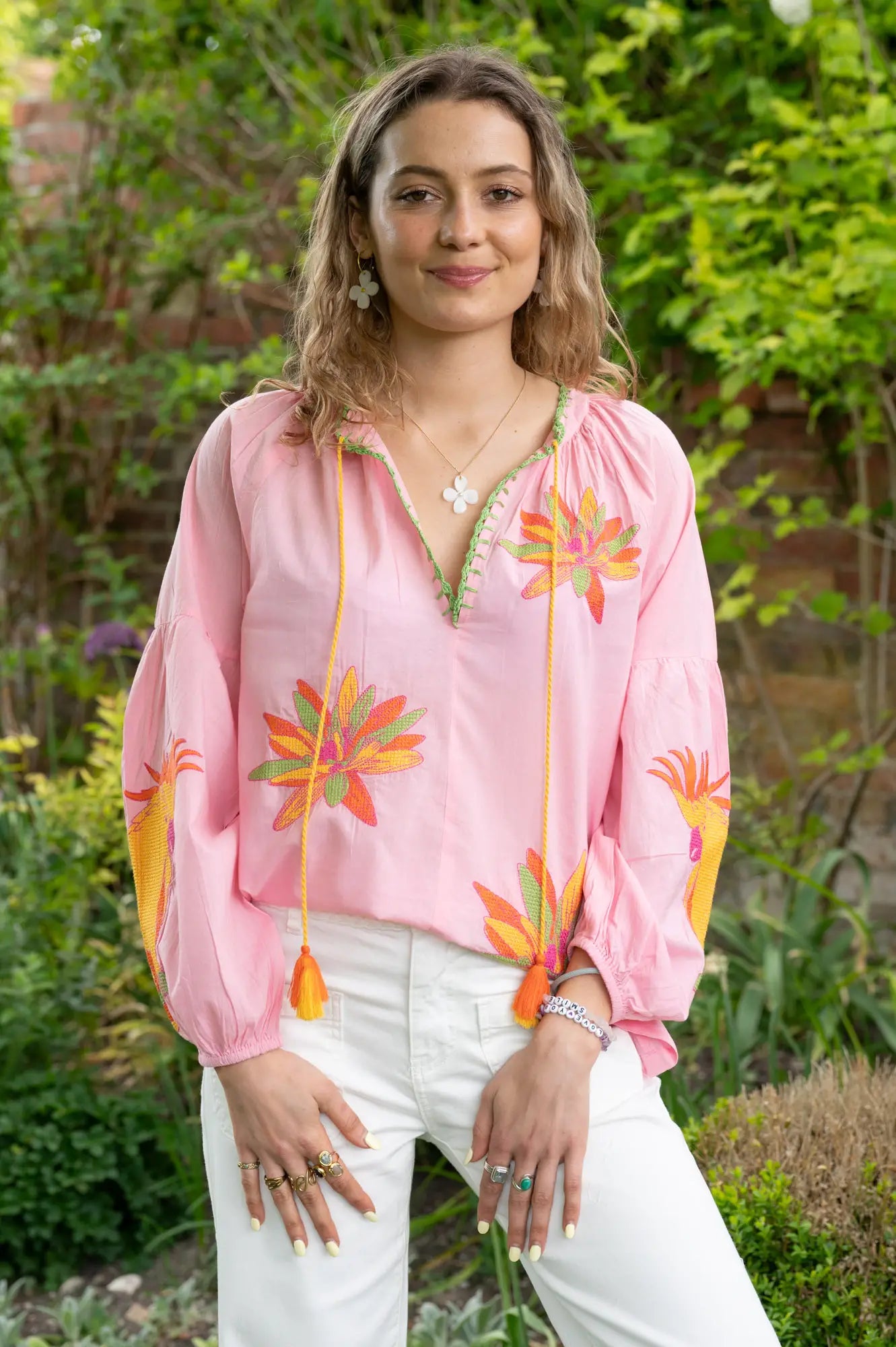 - Floral embroidery in green, orange & yellow