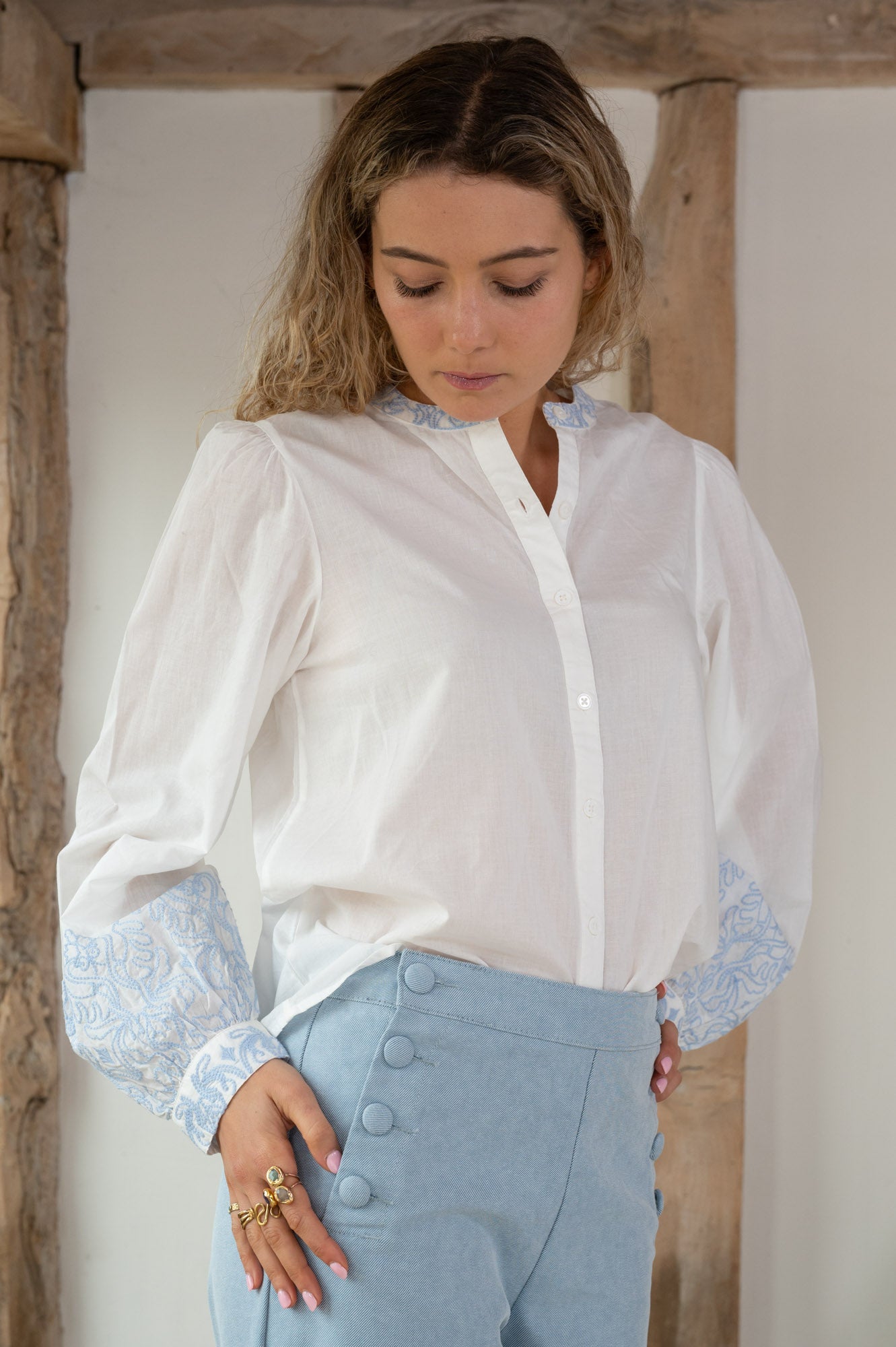 Gorgeous shirt with exquisite embroidery at neckline and cuffs...